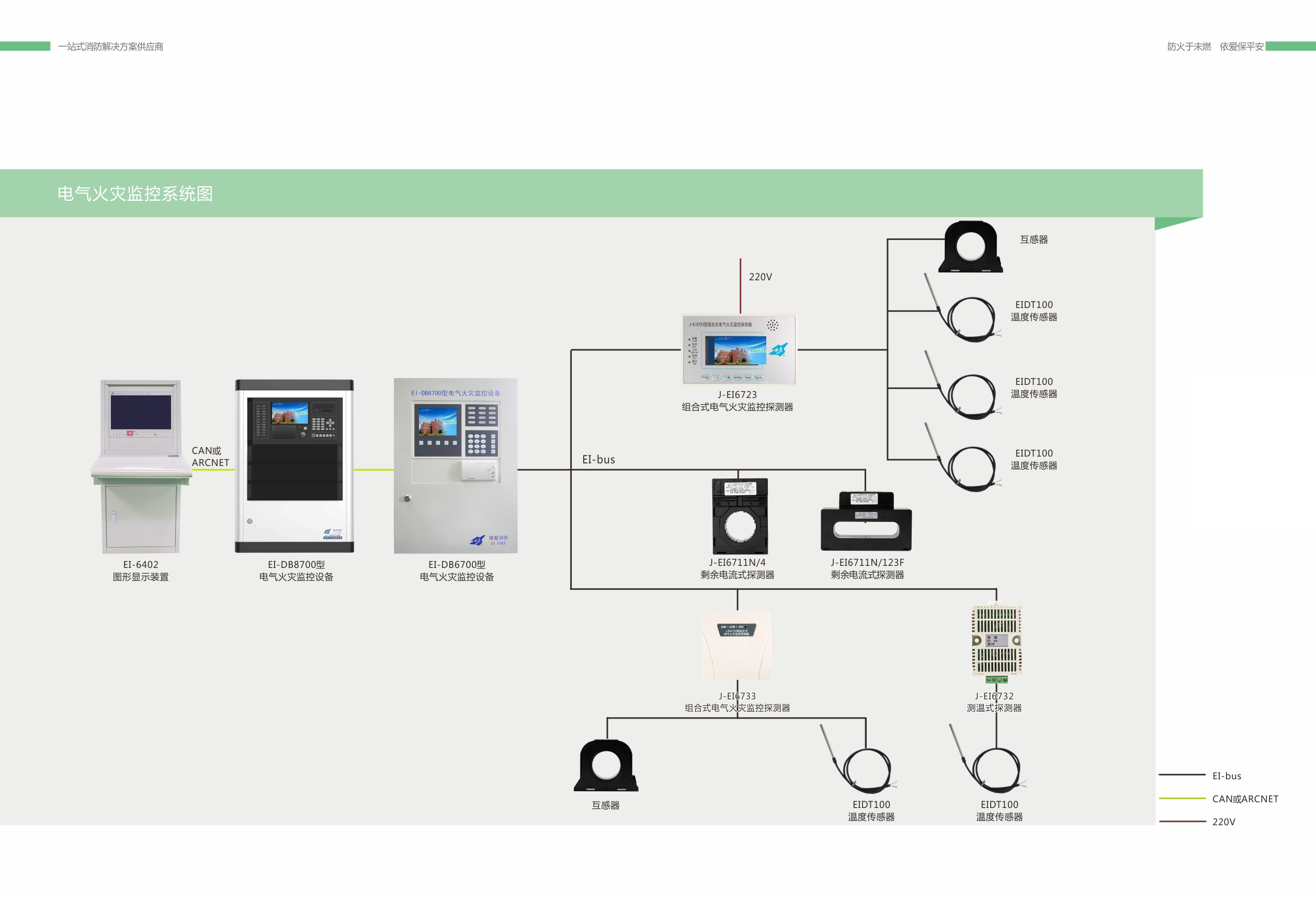 電氣火災監(jiān)控系統(tǒng)與火災報警系統(tǒng)是相輔相成的,并將作為火災報警系統(tǒng)的一個子系統(tǒng)(火災預警系統(tǒng))。本公司研發(fā)的 EI 系列電氣火災監(jiān)控系統(tǒng)既可以自成系統(tǒng),獨立使用,也可以接入消防控制室圖形顯示裝置,由消防控制室圖形顯示裝置顯示報警信息。