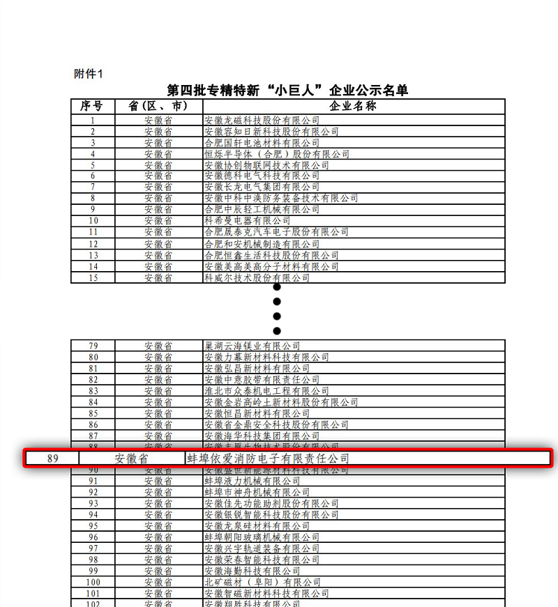 2022年88日,在安徽省經(jīng)濟(jì)和信息化廳官網(wǎng)公布的《關(guān)于安徽省第四批專(zhuān)精特新小巨人企業(yè)和第一批專(zhuān)精特新小巨人復(fù)核通過(guò)企業(yè)名單的公示》中,蚌埠依愛(ài)消防電子有限責(zé)任公司入選工業(yè)和信息化部第四批專(zhuān)精特新小巨人企業(yè)名單。