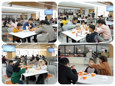 中午時(shí)分,家屬與員工一起到食堂就餐,感受到家的溫暖,其樂(lè)融融。